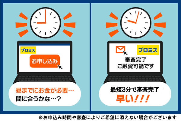 プロミスはスムーズに手続きをすすめれば、最短3分で審査を完了できます。WEB申込に対応しているため、忙しくて店舗へ行くことができない方にも最適です。